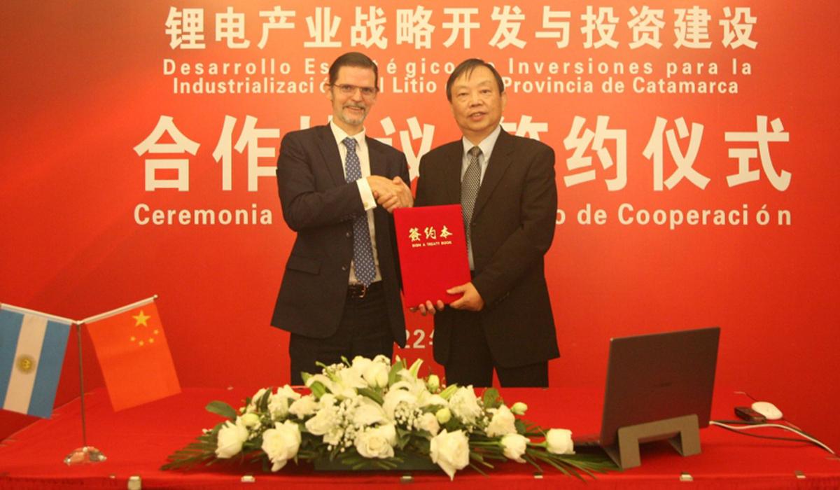 El gobernador y el vicegobernador de Catamarca, Raúl Jalil y Rubén Roberto Dusso, respectivamente; y el embajador de la Argentina en China, Sabino Vaca Narvaja, firmaron un acuerdo de cooperación con el presidente de la minera de ese país JinYuan, Xu Gang, para industrializar la cadena de valor del litio en esa provincia del norte.
