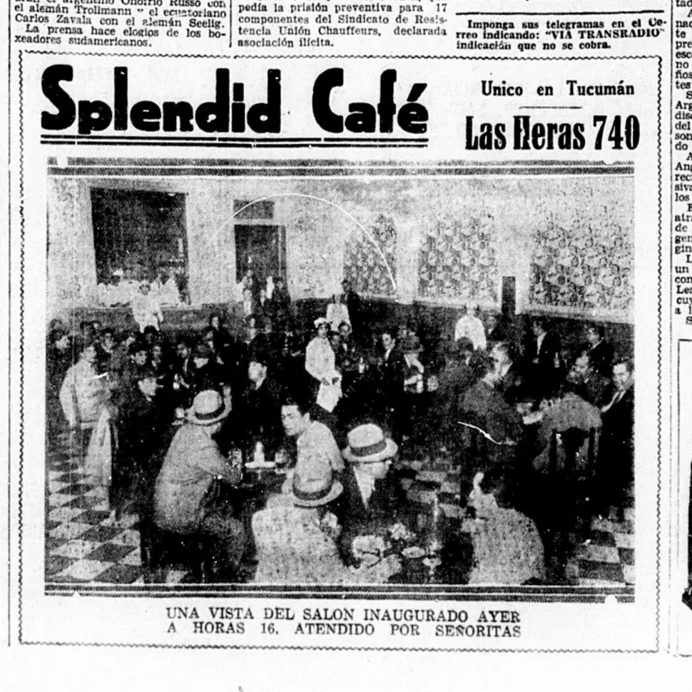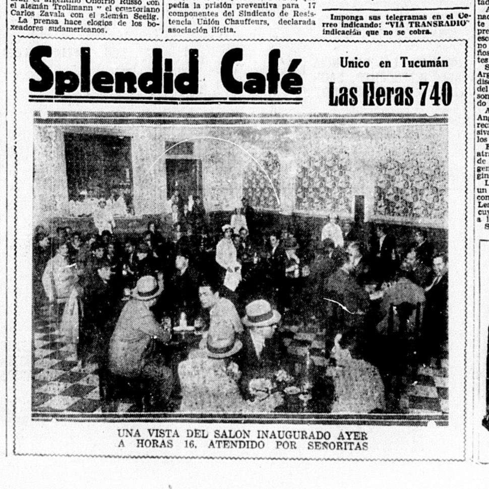 Buscando en el nuestras páginas encontramos una publicidad, con una gran foto del salón, que dice “único en Tucumán” y anunciaba la inauguración del “Splendid café” en calle “Las Heras 740” (hoy San Martín). Y el epígrafe decía: “una vista del salón inaugurado ayer (por el 14 de septiembre) a horas 16. Atendido por señoritas”. Allí se ve todas las mesas del establecimiento completas. Hombres sentados algunos con sombrero y las mesas con tazas de café y otras bebidas y sobre el fondo algunas damas también en su mesa. Al mismo tiempo se pueden ver a cuatro mujeres paradas vestidas de blanco entre las mesas y otras tantas en una ventana al fondo quizás por donde se pasaban los correspondientes pedidos a las mozas. Todos posan para la imagen quizás entendiendo que son parte de un momento histórico, al dar paso a las damas a trabajos hasta entonces reservados solamente para varones.