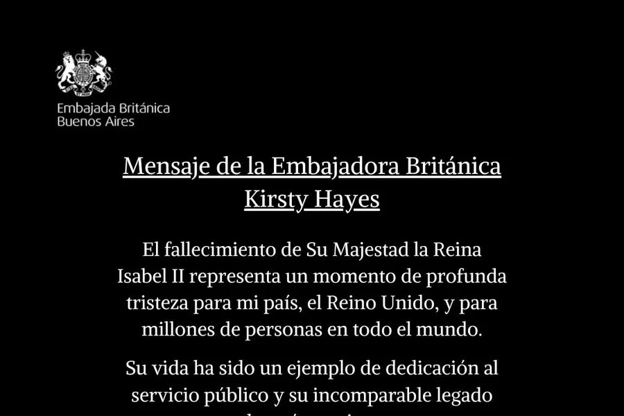 El gobierno argentino ofreció condolencias al pueblo británico y a la familia real. Así lo manifestó la Cancillería: “Isabel Alejandra María Windsor (1926-2022), Reina del Reino Unido bajo el nombre de Isabel II desde 1952. El Gobierno de la República Argentina expresa su pesar por su fallecimiento y acompaña al pueblo británico y a su familia en este momento de dolor”.