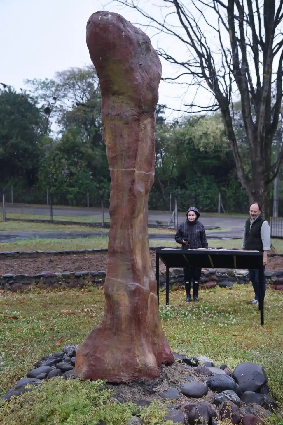 El parque cuenta con algunas reconstrucciones a escala de la fauna existente durante la Era Cenozoica. A un costado del sendero, un fémur de 2,45 metros nos hace levantar la cabeza para intentar dimensionar las proporciones de su antiguo dueño: un Patagotitan mayorum (el dinosaurio más grande del mundo, según los registros históricos).