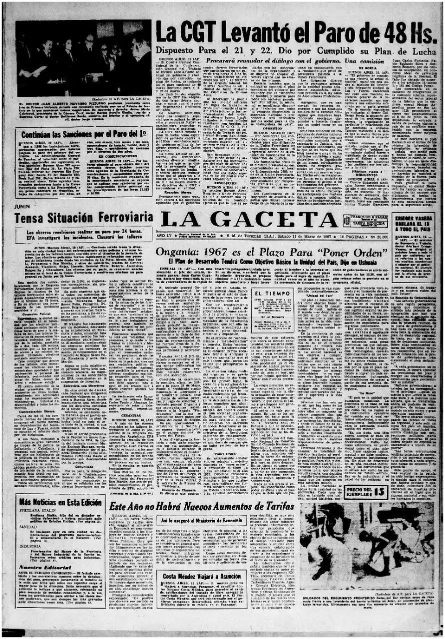 Como en 1939, la edición número 20.000 de LA GACETA repitió el día de salida: sábado. Ocurrió el 17 de febrero de 1967, 28 años después, cuando el diario cumpliría 55 años. Era el tiempo de la dictadura autodenominada “Revolución Argentina”, que impuso en la presidencia a Juan Carlos Onganía tres el derrocamiento del gobierno constitucional de Arturo Illia. La tapa de esa jornada, a diferencia de la 10.000, se detenía en la información nacional: “La CGT levantó el paro de 48 horas”; era el título central, acompañado de un segundo en importancia: “Onganía: 1967 es el plazo para poner orden”, y que aludía a la intención de la gestión militar de unir al país. Además se anunciaba que durante el año habría nuevos aumentos de tarifas.