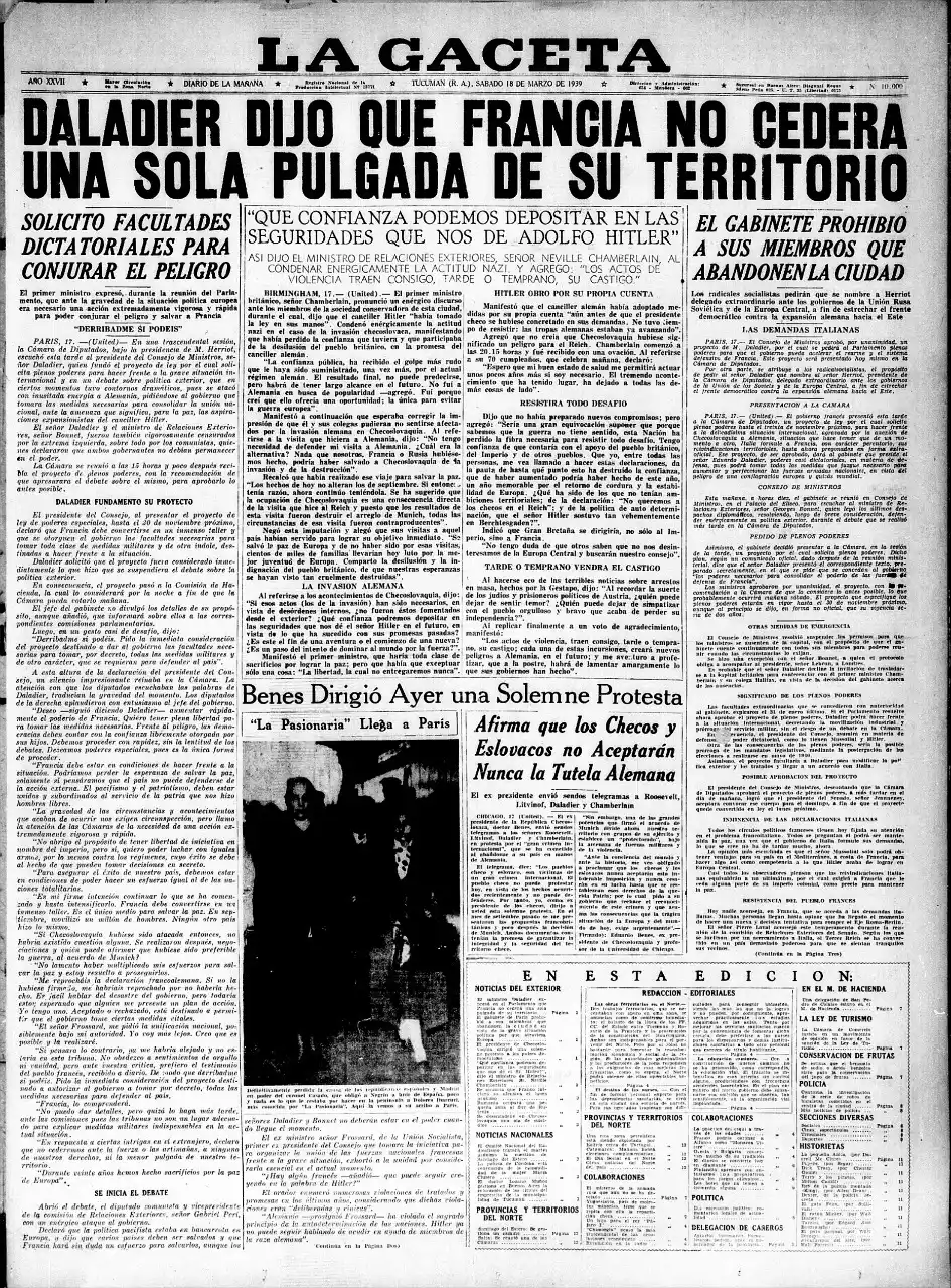 Veintisiete años después, el sábado 18 de marzo de 1939 salió la edición número 10.000 de LA GACETA; el año de la Segunda Guerra Mundial, y en la portada, a seis columnas y con un título a dos líneas pintaba el clima beligerante que reinaba en Europa y que luego desataría el conflicto bélico: “Daladier dijo que Francia no cederá una sola pulgada de su territorio”. La tapa, con excepción de un índice de temas en las páginas interiores, estuvo dedicada a lo internacional; basta repasar los otros títulos: “Qué confianza podemos depositar en las seguridades que nos de Adolfo Hitler” (Neville Chamberlain), Solicitó facultades dictatoriales para conjurar el peligro, El Gabinete prohibió a sus miembros que abandonen la ciudad (París), Benes dirigió ayer una solemne protesta, Afirma que los checos y los eslovacos no aceptarán nunca la tutela alemana. Luego, desde el 3 de septiembre, la cobertura de la guerra ocupará las primeras planas y las noticias nacionales, salvo las de gran importancia, quedarán para las páginas interiores. Ese año fallece el papa Pío XI, se suicida Lisandro de la Torre y a fin de año se enfrenta el acorazado alemán “Graf Spee” contra naves inglesas frente a Punta del Este.