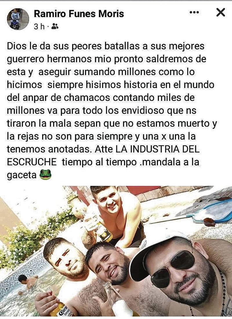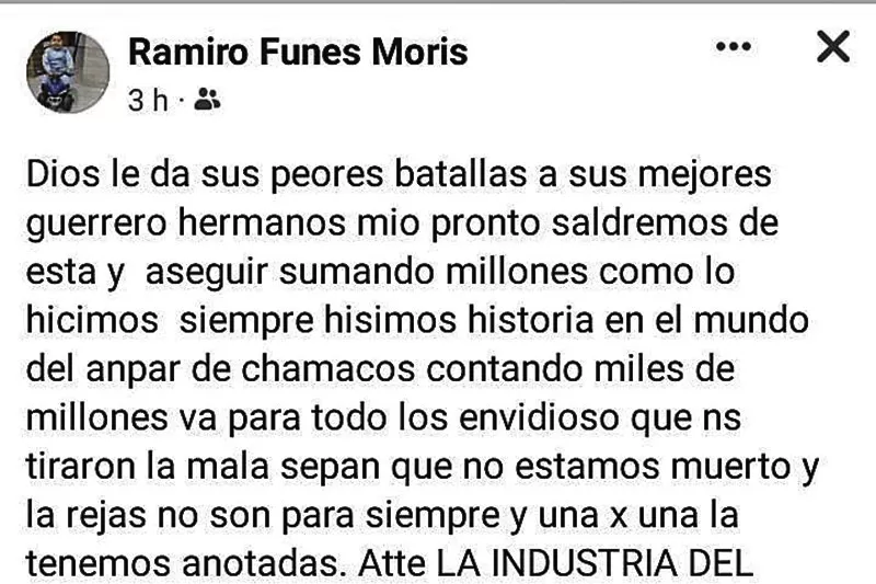 “Mandá (la foto) a LA GACETA”, concluye el mensaje de un supuesto allegado al clan Caro. En el posteo el usuario se lamentó por la detención de los cuatro hermanos, criticó a los “envidiosos” y auguró que cuando salgan podrán volver a “seguir sumando millones”.