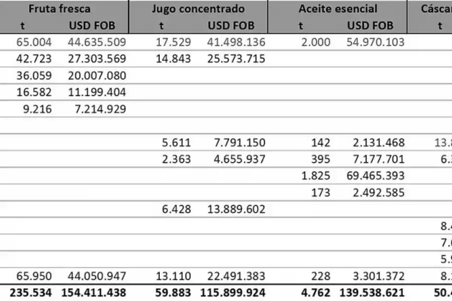 Entre los principales destinos, los volúmenes exportados de mayor crecimiento interanual correspondieron a EEUU (113%) en fruta fresca; a Países Bajos (26%) en jugo concentrado, a EEUU (47%) en aceite esencial y al grupo confidencial (85%) en cáscara deshidratada. Los volúmenes y valores de la exportación realizada a los cinco primeros destinos de la fruta fresca y sus subproductos se observan en la Tabla 2.