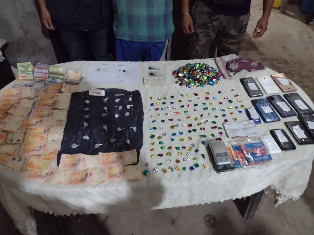 Como resultado del allanamiento, se secuestraron 1.204 envoltorios de papel glasé tipo "ravioles", con un peso total de 216 gramos de cocaína, 21 envoltorios plásticos tipo "bagullos" con un peso total de 22 gramos de marihuana; la suma de $ 209.300, 11 celulares, una balanza digital pequeña, sobres de Papel Glasé y documentación.
