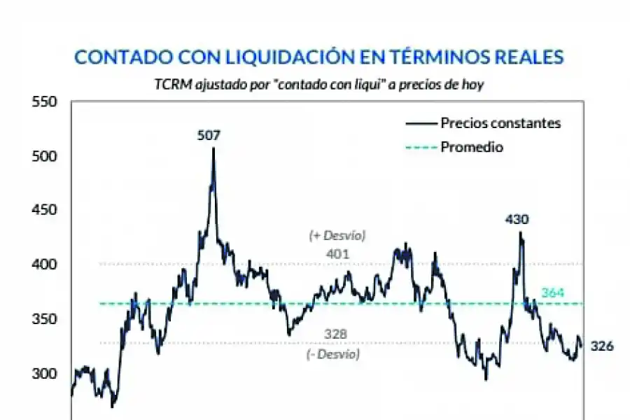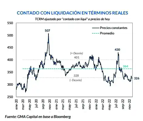 Poniendo el foco sobre el CCL, el valor de hoy estaría varios escalones por debajo del promedio en términos constantes desde la irrupción de la pandemia. “Este análisis, que contempla el tipo de cambio real multilateral (TCRM) ajustado por la brecha cambiaria, indica que el precio de $ 326 no solo es un 10% inferior a la media de $ 364, sino que además está por debajo de un desvío estándar ($ 328)”, puntualiza. Más allá de la dinámica de corto plazo, asumiendo que existe reversión a la media, por este lado la cotización tendría más razones para subir que para bajar, de acuerdo con la visión de GMA.