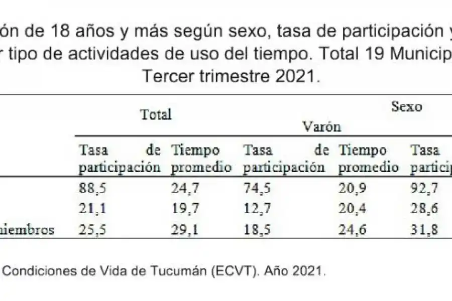 A su vez, el 25,5% de la población participa del cuidado de otros miembros del hogar, ya sean niños o adultos mayores. La tasa de participación de las mujeres en estas actividades es de 31,8% del total de las encuestadas y le dedican en promedio 31,2 horas. Por su parte, los hombres tienen una tasa de participación del 18,5% y dedican 24,6 horas a esta tarea por semana, según el reporte trimestral al que accedió LA GACETA.