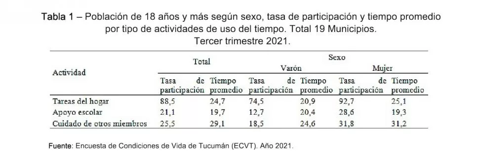 Las encuestas de uso del tiempo relevan datos sobre cómo las personas distribuyen su tiempo durante el día y reflejan en detalle el transcurrir de nuestra vida diaria, definió el titular del Instituto Nacional de Estadística y Censos (Indec), Marco Lavagna, al presentar la Encuesta Nacional de Uso del Tiempo 2021. Comer, trabajar, estudiar, cocinar, limpiar la vivienda, socializar, mirar televisión, ayudar a otras personas, leer, viajar, esperar en una fila, practicar un deporte, dormir y asearnos son algunas de las actividades que podemos realizar en 24 horas. Saber con exactitud cuáles son y quiénes las realizan, el tiempo que insume cada una de ellas y cómo varían según las características socioeconómicas de la población constituye una potente herramienta estadística de análisis para orientar su desarrollo. El último reporte trimestral de la Dirección de Estadística de la Provincia ha revelado que, más allá de las actividades laborales que se llevan gran parte del tiempo cotidiano, las tucumanas le dedican cuatro horas más por semana que los hombres a las tareas del hogar. La tasa de participación (como porcentaje de la población) es mayor en las mujeres (92,7%) que en los hombres (74,5%). En cuanto al tiempo asignado a estas tareas, el diagnóstico del organismo dirigido por el economista Raúl García señala que ellas le dedican, en promedio, 25,1 horas por semana, mientras que ellos un tiempo promedio de 20,9 horas.