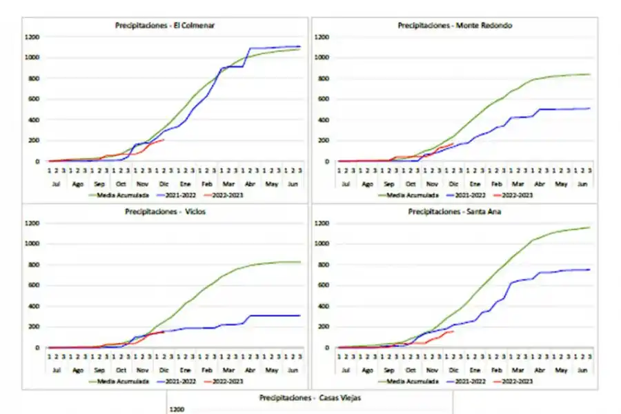 Como se aprecia en la Figura 3, las lluvias acumuladas al 13 del mes en curso en las cinco localidades seleccionadas se encuentran por debajo de los valores normales. Por el contrario, respecto de la campaña pasada, en El Colmenar y en Santa Ana los valores de esta campaña están por debajo; en Monte Redondo, un poco por encima, mientras que en Viclos y en Casas Viejas son similares a los de la campaña 2021-2022.