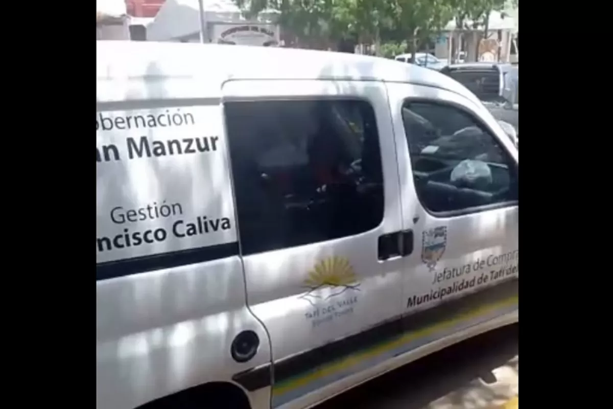 El utilitario de color blanco tenía el logo de la Jefatura de Compras de Tafí del Valle y las publicidades de Juan Manzur (gobernador en uso de licencia) y el propio intendente tafinisto -en Tucumán no está en vigencia la ley de ética pública-.