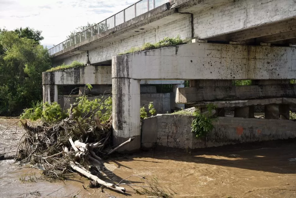 El caudal es pesado y de un color marrón chocolatoso. La fuerza del agua golpea la parte inferior de las columnas, que todavía retienen algunos árboles desprendidos río arriba durante las tormentas.