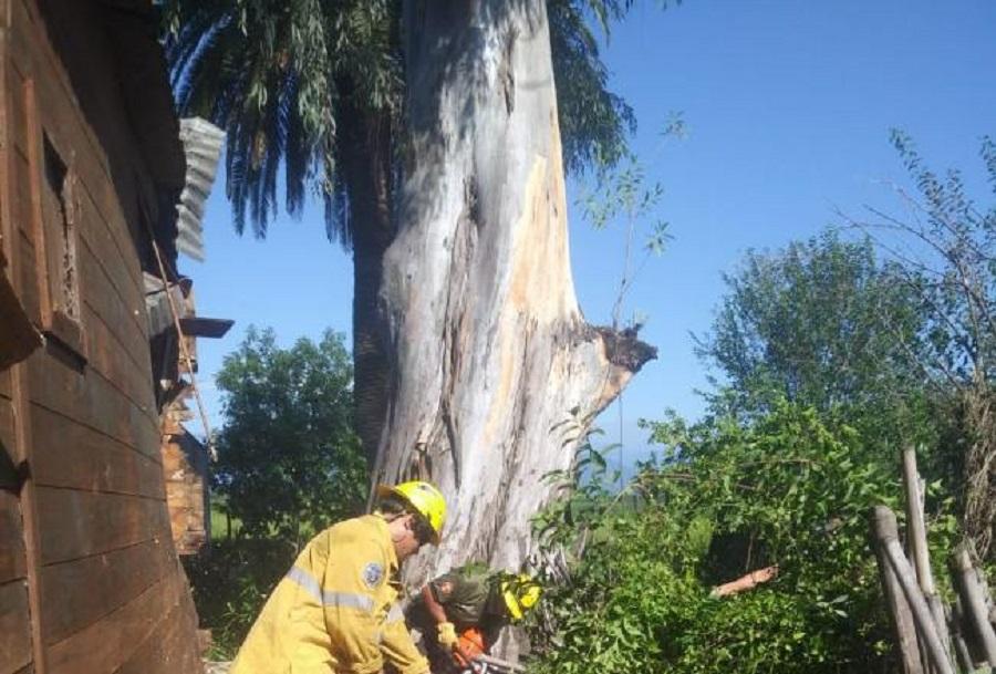 El titular de la Dirección Provincial de Defensa Civil, Fernando Torres informó que la caída de una parte de un inmenso eucalipto destruyó seriamente la vivienda de la Familia Rodríguez en la localidad García Fernández.