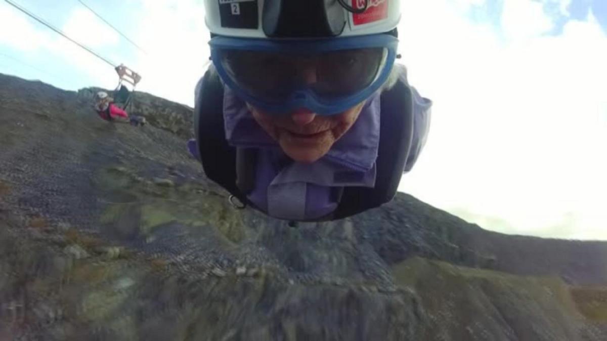 Una mujer de 85 años, residente de un hogar de ancianos, alcanzó velocidades de 160 kilómetros por ahora mientras surcaba el cielo en lo que se dice que es la tirolesa más rápida del mundo.