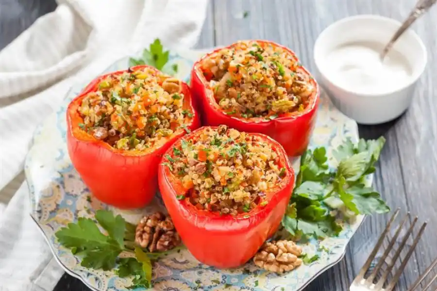 Como la quinoa es un gran sustituto del arroz, son muchas las verduras que pueden ir rellenas, tomates, berenjenas, zapallitos, y en este caso, pimientos.Esta es una receta para comer sano y disfrutar, especialmente para acompañar a la parrilla de los domingos. El resultado es una opción perfecta para cuidarse, apta para veganos, celíacos e intolerantes a la lactosa.