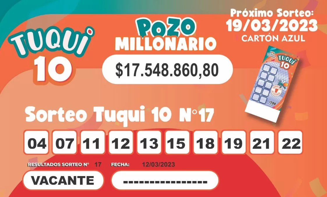 El domingo pasado, el pozo del Tuqui 10 quedó vacante una vez más y acumuló un total de $17.548.860 para el próximo sorteo que se realizará el 19 de marzo con cartón azul.