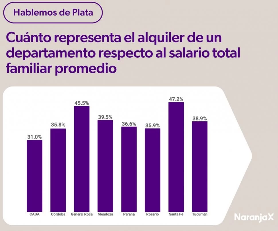 Según la consultora, una familia argentina promedio destina alrededor de un tercio de sus ingresos (32,4%) a pagar el alquiler de un departamento de un ambiente en CABA y casi la mitad un (47,1%) en Santa Fe, considerando ingresos totales promedios al mes de $ 246.238 y $ 159.151, respectivamente. Para este análisis se consideró el ingreso total familiar promedio de cada aglomerado urbano analizado en base a la Encuesta Permanente de Hogares del Instituto Nacional de Estadísticas y Censos (Indec) y ajustados por índice de salarios.