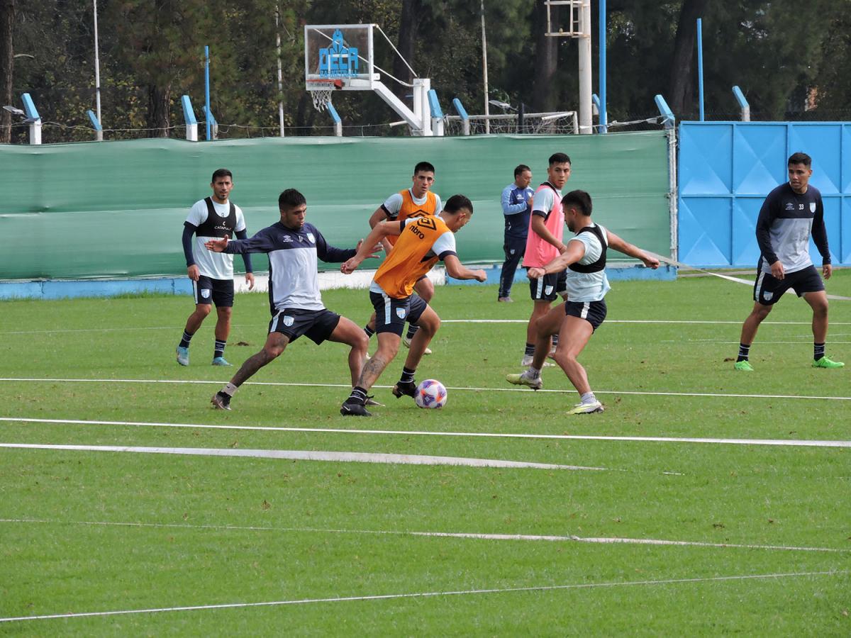 INTENSIDAD. Braian Guille (de buzo) marca a Lucas Naranjo (que lleva la pelota dominada) junto a Francisco Di Franco. Los que no fueron titulares el sábado, ayer tuvieron una sesión de fútbol reducido.