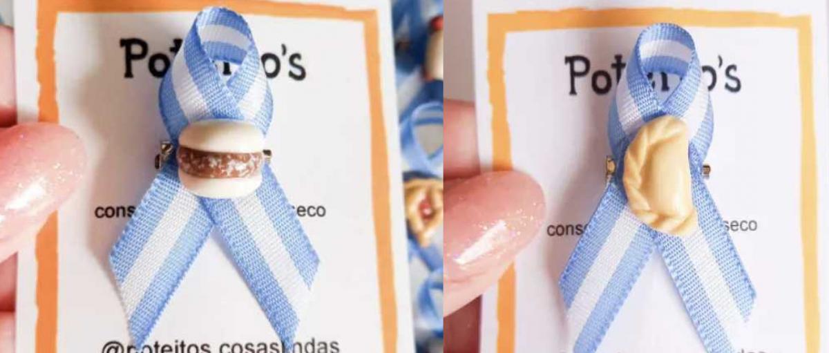 Las cintas blanquicelestes lucen en su centro diferentes formas: un pequeño mate, un alfajor de maicena, una empanada con repulgues diminutos, una porción de pastafrola, un alfajor de chocolate con dulce de leche, un chipa ¡y hasta un choripán!