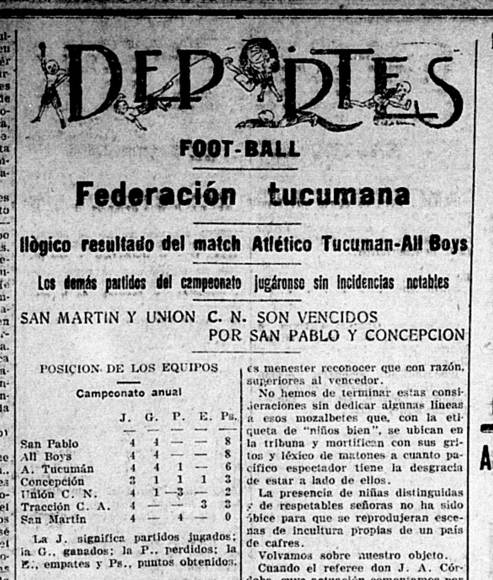El cronista destacaba que “San Martín se ha impuesto por su cabales y porque ha sido 'más cuadro'” y agregaba que “pareciera que factores extraños se encargaron de desvirtuar ciertos asertos. Allí está por ejemplo el caso del domingo. El cuadro que marcha a la cabeza del campeonato federacionista ha sido evidentemente inferior al que ocupa el penúltimo puesto”. Ante el triunfo santo se consideraba que el torneo central se vería optimizado y se resaltaba que “ahora lo papeles se han cambiado y hasta encontramos tonificante este triunfo de los santos, porque el contribuirá a hacer más interesante el campeonato federacionista y los otros concursos a realizarse bajo el patrocinio de esta entidad”.