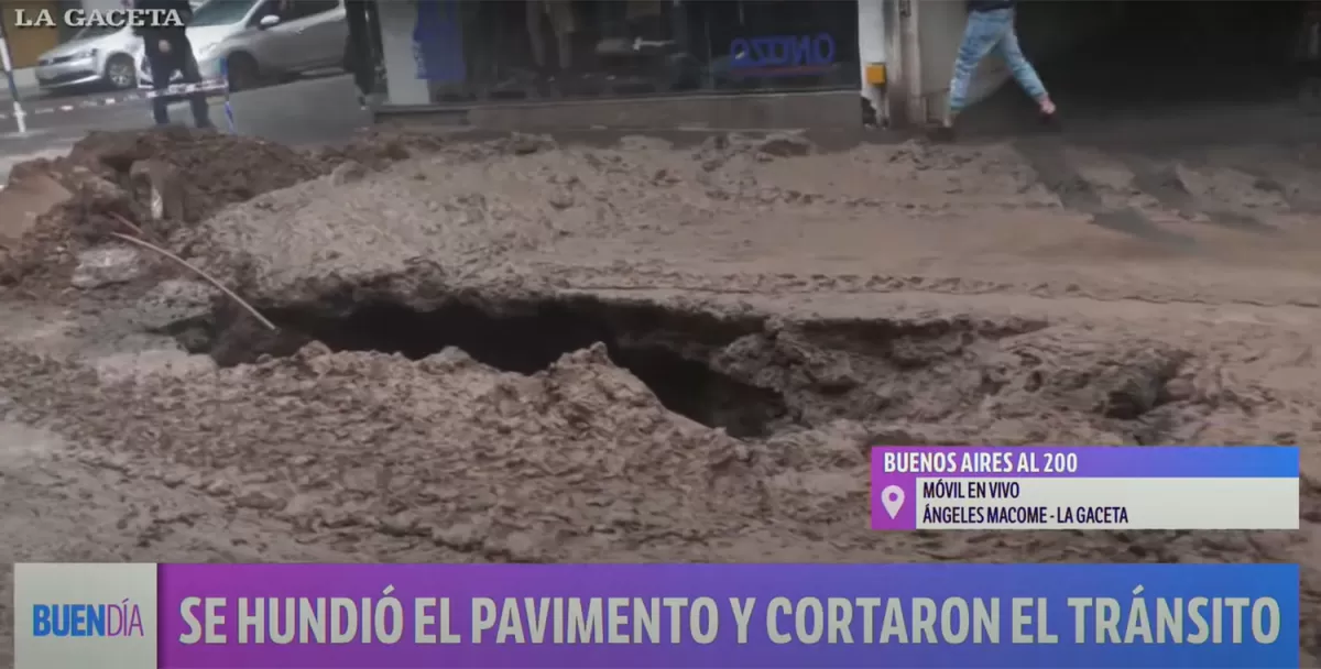 Una obra de Sociedad Aguas del Tucumán (SAT) en la calle Buenos Aires al 200 provocó el hundimiento del pavimento, a metros de la esquina con la calle San Lorenzo, y el tránsito fue interrumpido en esa zona de barrio Sur.