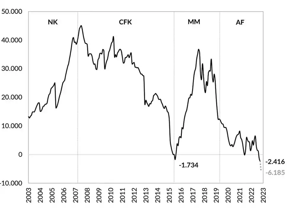 Según los últimos datos oficiales, el Banco Central contaba con un stock de DEG de U$S 1.600 millones, monto que resulta insuficiente de cara al mencionado vencimiento. El resto se cubrió con yuanes. Es decir, por primera vez en la gestión presidencial de Alberto Fernández, el Gobierno usó recursos propios para pagarle al Fondo. La cuestión medular es que las reservas netas navegaban en los niveles más bajos de los últimos 20 años, perforando U$S 2.400 millones en terreno negativo, advierte GMA. Y ahora, con el pago efectuado, se irían transitoriamente a la zona de U$S 5.100 millones, una barrera jamás perforada en más de dos décadas. Además, el 9 de julio el Gobierno debería afrontar pagos en concepto de cupones de Bonares y Globales por U$S 1.070 millones (U$S 750 millones a privados). Como resultado, las netas serían negativas en más de U$S 6.000 millones.