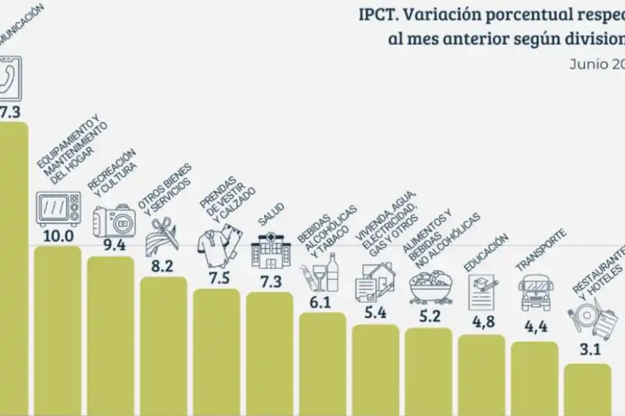 Las categorías que más aumentaron fueron Comunicación, con un registro de un 17,3%, seguida por Equipamiento y mantenimiento del hogar (10%), por Recreación y Cultura (9,4%), por Otros Bienes y Servicios (8,2%), por Prendas de Vestir y Calzado (7,5%), y por Salud (7,3%).