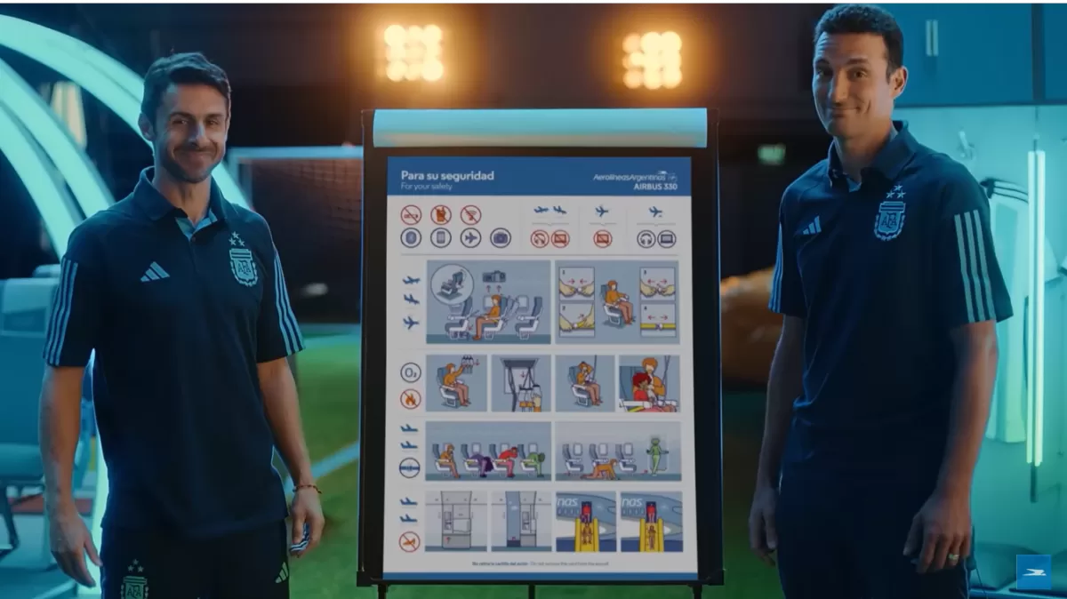 Aerolíneas Argentinas grabó un spot de seguridad para reproducir en sus vuelos protagonizado por el cuerpo técnico del seleccionado argentino, Campeón del Mundo Qatar 2022.