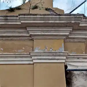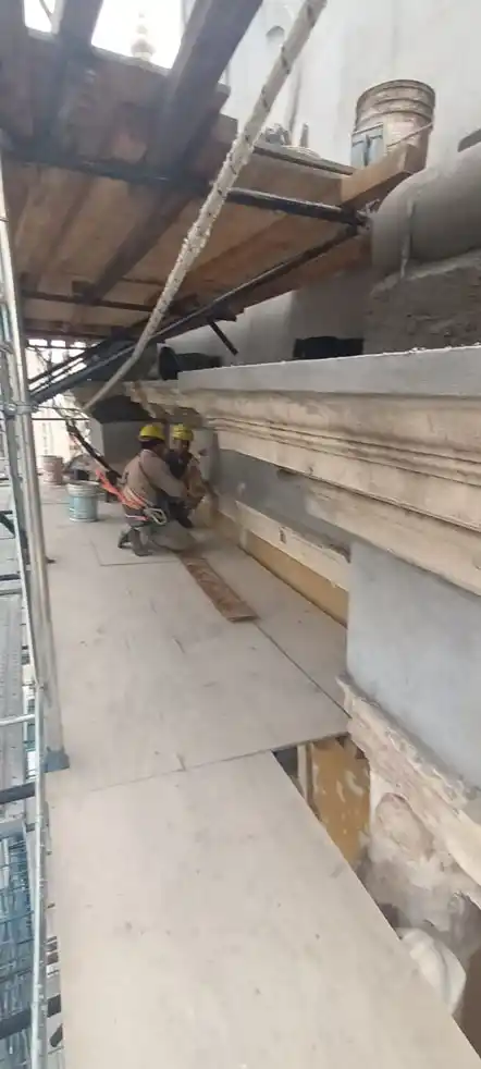 El trabajo de restauración de cornisas y molduras se inició con la reconstrucción de la capa superior de las cornisas, lo que permitió consolidar las superficies y las pendientes de desagote, mediante el uso de morteros hidrófugos.