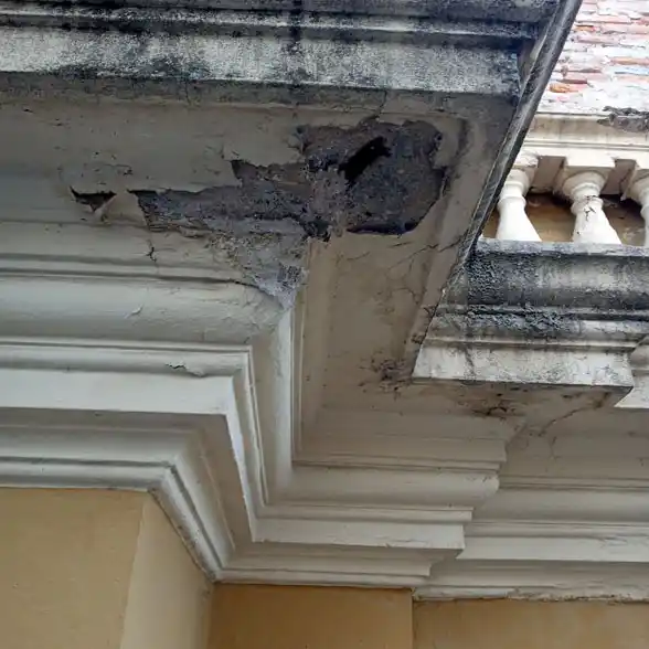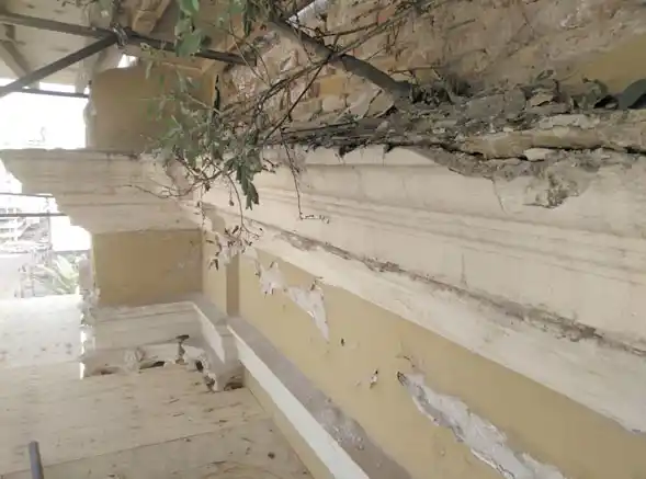 Las cornisas están construidas por piezas cerámicas (ladrillones y tejuelas) con refuerzos de planchuelas metálicas. Su plano superior se encontraba deteriorado casi completamente, con los revoques carcomidos y en muchos casos desprendida la tejuela. En numerosos sectores habían crecido plantas parásitas de tamaño importante, las que, con sus raíces, habían acentuado los problemas: ingreso de agua de lluvia, deterioro del revoque de las caras inferiores y oxidación de refuerzos metálicos, entre otros deterioros.