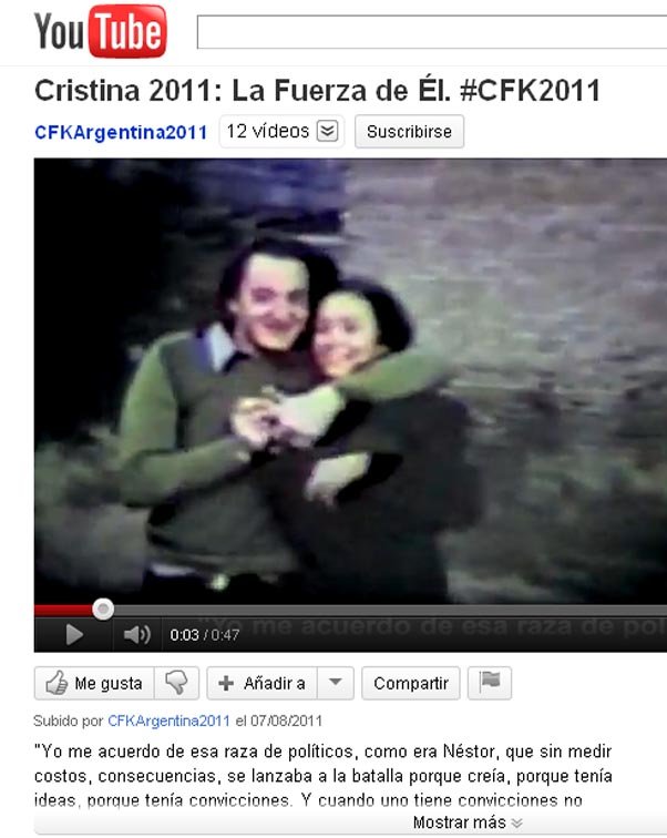 El video, con imágenes de la actividad del patagónico y frases alusivas a Perón, culmina con un concepto que apela al recuerdo para conmocionar electoralmente: "la fuerza de él, Cristina Presidenta".