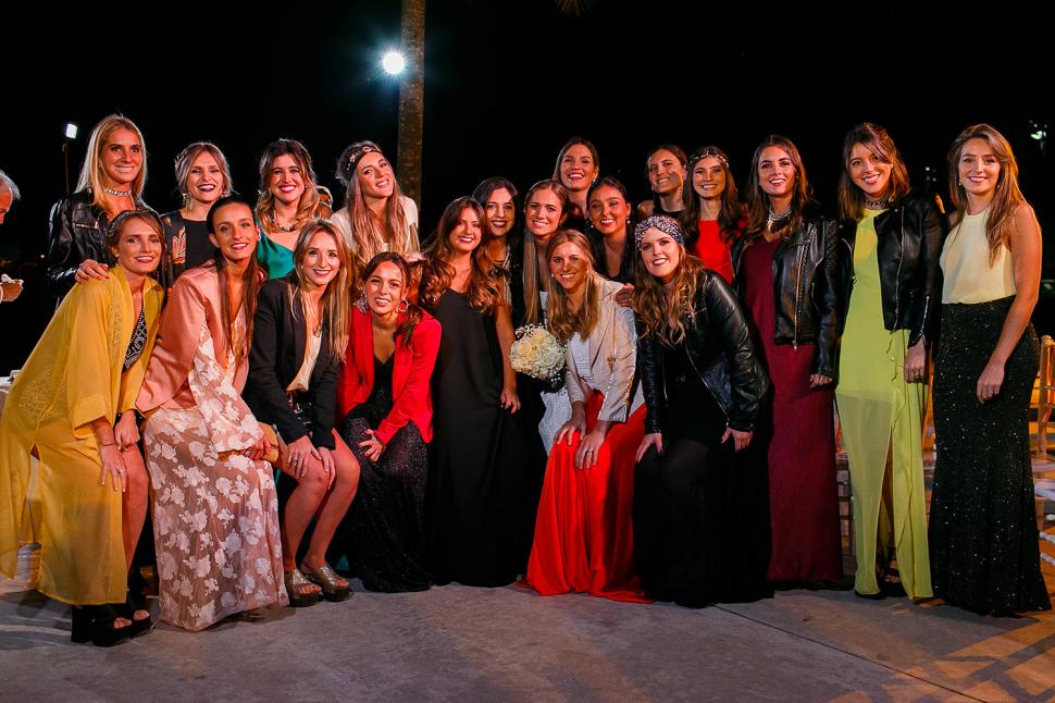 Arriba: “Lulú” Merletti, “Guada” Casas, “Lucre” Rodríguez Prados, “Uqui” Usandivaras, los recién casados, Susana Posse, Mariana Merletti y Valentina Sanz. Abajo: Facundo Rodríguez Prados, Fernando Casabal, Felicitas, César y “Francis” Rodríguez Prados, Pablo y Mario Merletti.